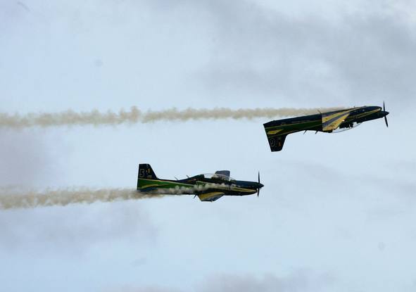 ARRIBA YA ABAJO. Un grupo de la Fuerza Aérea del Brasil realizó un arriesgado show con aviones con motivo de la conmemoración del 165 aniversario de la independencia de República Dominicana