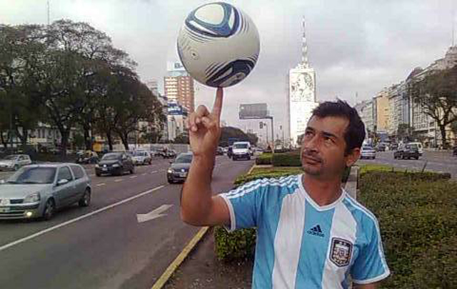 Luis Alberto Molina Alcaino, de 30 años, contó a Cadena 3 que lleva más de 10 años realizando este arte, con el que recorre Sudamérica. Esta mañana el DT de la Selección Argentina, Alejandro Sabella, le dejó 5 pesos de propina.