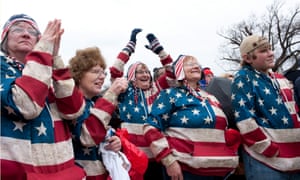 Dan Egeland and Hetty Hennessey, from Boulder, Colorado, stand with Republicans during the Pledge of Allegiance as they watch the inauguration of Donald Trump from a restaurant in Denver